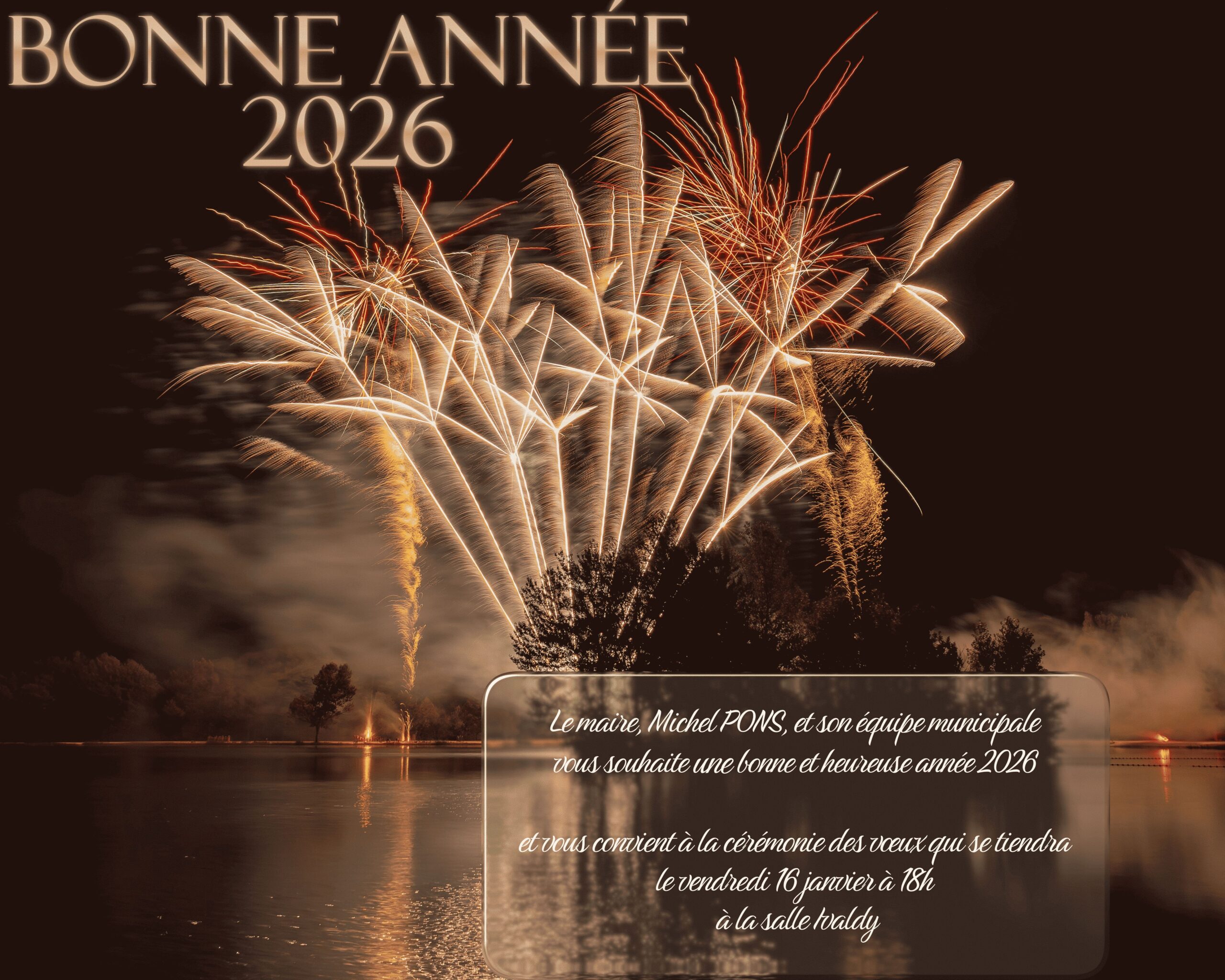 Le maire, Michel PONS et son équipe municipale vous présentent leurs meilleurs vœux pour 2026 et vous convient à la cérémonie de présentation des vœux à la population le vendredi 16 janvier à18h, salle Ivaldy.